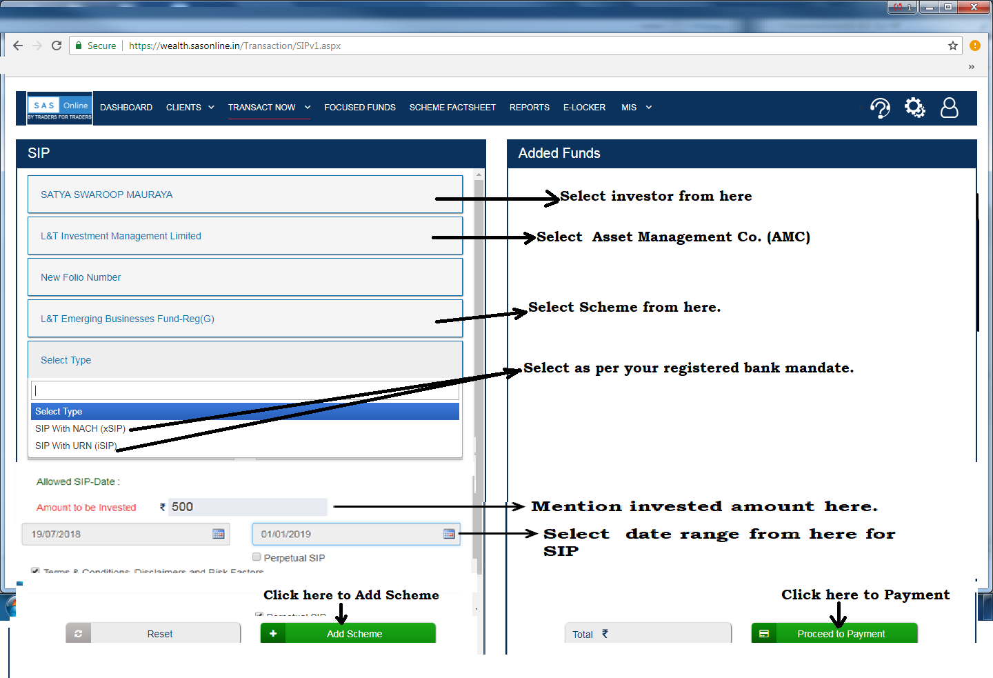 You can start SIP investment from minimum Rs. 500/- ’Transact Now’ section, like hereunder :